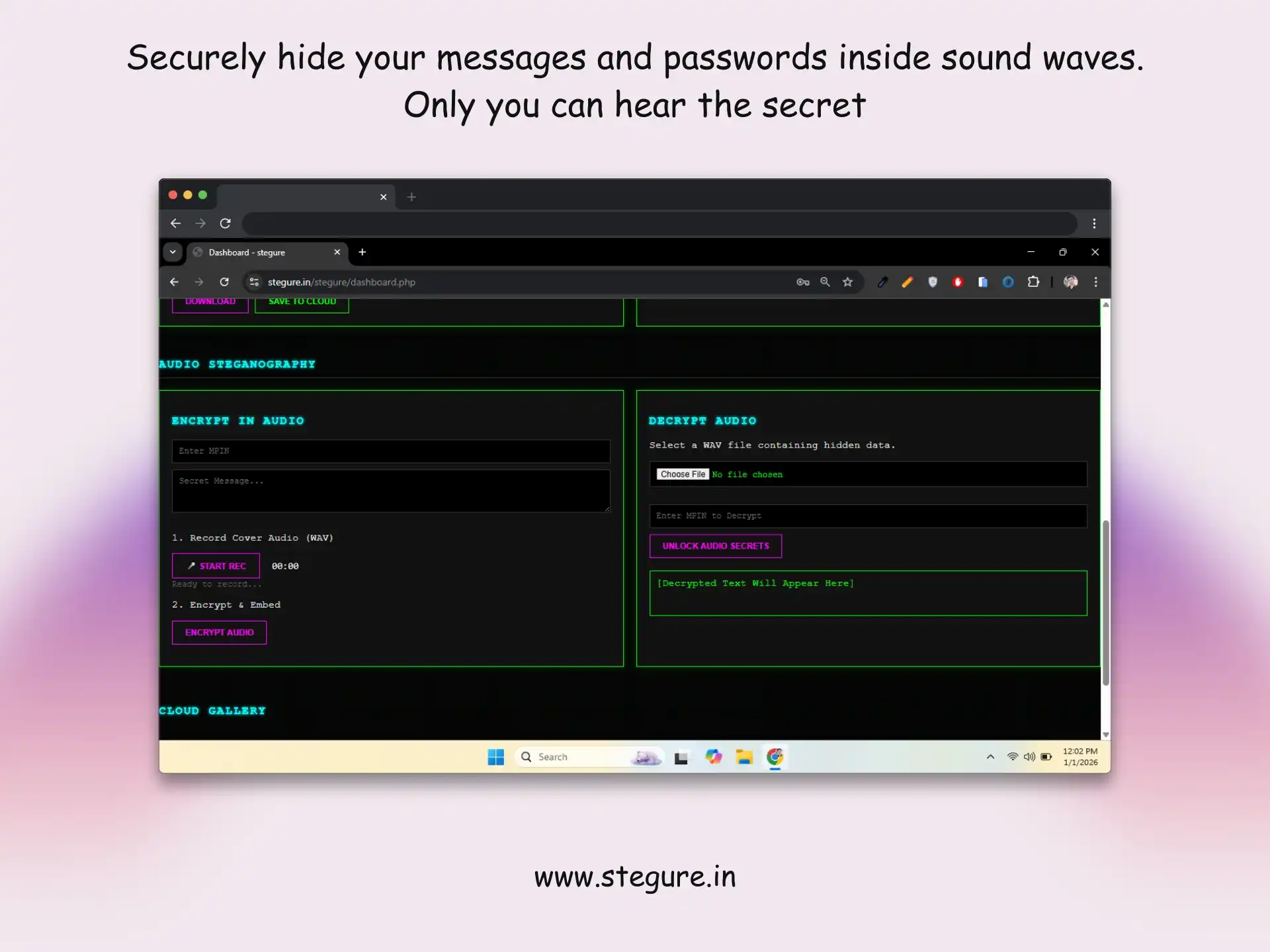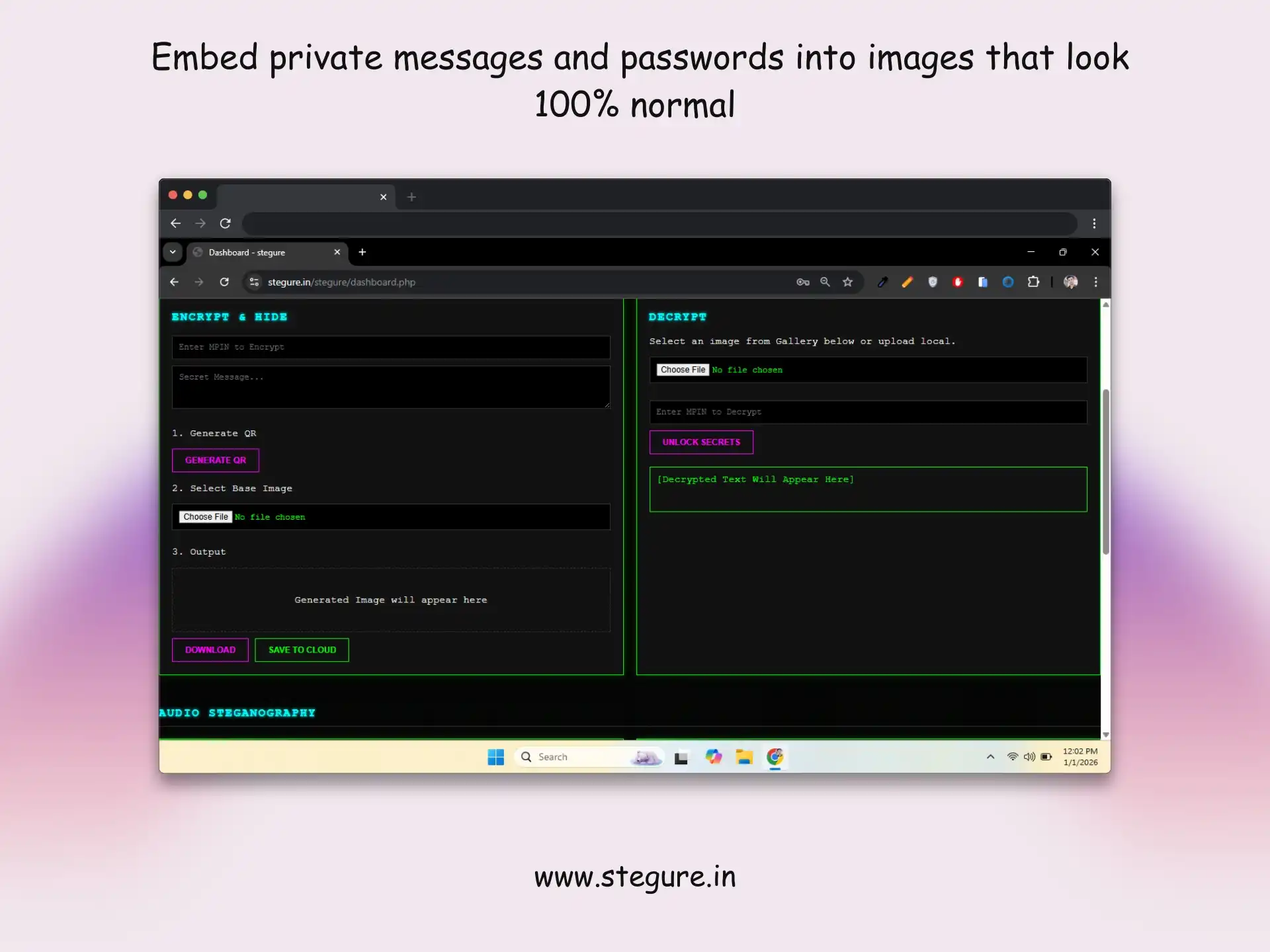 Stegure doesn't just lock your data; it makes it disappear. Experience the next level of digital privacy where security meets invisibility.